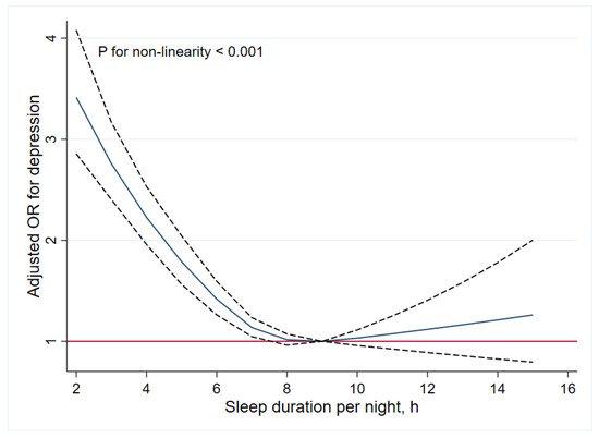 Respondents’ general characteristics were compared by depression status using analyses of variance for numerical variables and ordinal chi-square tests for discrete variables. Numerical variables were presented as means ± standard deviation (SD). Categorical variables were reported as numbers and percentages (%). Unadjusted and multivariable generalized linear models (GLM) with binomial families and log links were adopted to examine the associations between sleep duration and depression, and odds ratios (ORs) and 95% confidence intervals (CIs) were reported. Restricted cubic splines with four knots at the 5th, 35th, 65th, and 95th centiles were used to examine the association of sleep duration per night with depression. Age, sex, education, marital status, tobacco and alcohol use, household income, physical activities, ADLs, residence, sensory impairment (visual and hearing impairment), self-reported health status, life satisfaction, daytime napping, chronic disease condition, and sample weights were included in the GLM models as covariates. A two-sided p < 0.05 was considered to be statistically significant. All data analyses were performed with Stata version 14.0 (StataCorp).