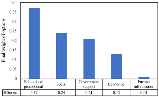 According to the results obtained from a pairwise comparison of educational-promotional factors—the use of publications, the use of radio and television, holding classes and training courses, the distribution of magazines and educational publications, the use of training workshops, and communication with relevant specialists (agricultural promoters)—the factor (option) of farmers’ knowledge and information was superior. A pairwise comparison of the criteria for government support—the delivery of subsidized inputs to the recipients of water resources management and the material and spiritual incentives of the recipients of water resources—showed that the knowledge and information of farmers was superior over other factors.