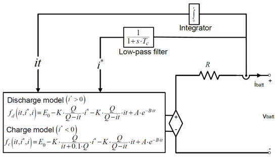 where denotes the battery open circuit voltage at full capacity, is the polarization coefficient, denotes the capacity of the battery, is the removed actual charge (), is the current of the battery, is the battery’s internal resistance, is the amplitude of the exponential zone, and represents the inverse time constant of the exponential zone. The modified Shepherd model given in [33] used polarization resistance effect and polarization voltage term in the discharge model as follows: