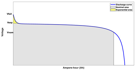 where represents the initial state of charge. Figure 2 shows the typical discharge characteristic of a Li-ion battery; Vfull, Vexp, and Vnom are the battery voltages at maximum capacity, at capacity during the end of the exponential zone, and at normal operation capacity, respectively.