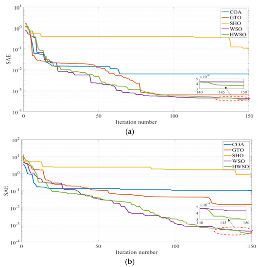 The mean convergence curves obtained with the HWSO, WSO, and other comparable techniques in the cases of (a) battery 1 and (b) battery 2.