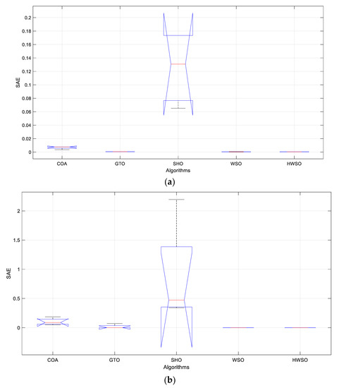 Boxplots of the objective function values obtained with the HWSO, WSO, and the other comparable techniques in the cases of (a) battery 1 and (b) battery 2 throughout the set of independent runs.