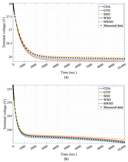 For testing the accuracy and efficiency of the identified parameters in representing the batteries’ behavior, the simulated model was implemented over a time horizon longer than that used in the optimization stage. The considered time of the simulation was 10,000 s. The fitted curves based on the identified parameters by HWSO and other techniques for the two batteries are depicted in Figure 6. The curves illustrate the high accuracy in the fitting while using the identified parameters of the HWSO that affirm its superiority in providing the highest quality solutions.