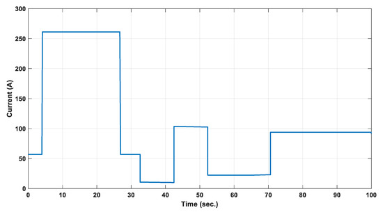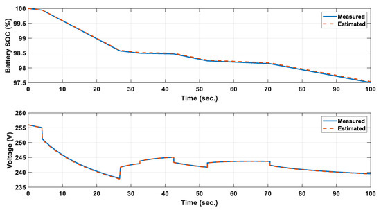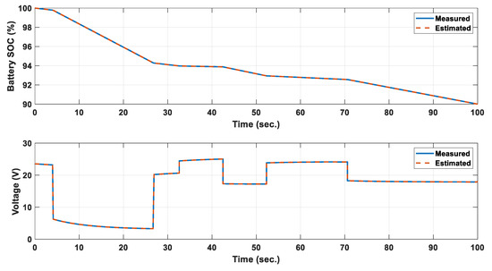 In order to validate the proposed HWSO, the current pattern shown in Figure 7 is applied on both considered batteries. The actual data given in Table 3 were used to collect the measured data. The measured and estimated SOC and terminal voltage via the proposed approach of battery 1 are shown in Figure 8; the results clarify that both data are closely matched. Furthermore, the measured and estimated data for battery 2 are given in Figure 9, and both curves converge. The obtained curves confirmed the preference of the proposed HWSO in constructing a reliable circuit of a Li-ion battery under a variable current pattern.
