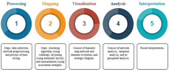 After obtaining the outputs of RStudio and VOSviewer, the authors carried out some steps to improve the visualization. In this stage, the authors referred to some studies [70,71,72,73,77,78,79,80], that suggest processing and analysis steps, as shown in Figure 1.