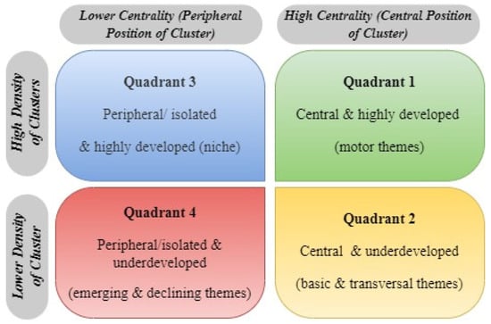 Callon’s strategic diagram was used; this was first created by Callon and his colleagues [77] and then developed by Aria and Cuccurullo [70] for bibliometrics using the R language, as presented in Figure 2. They [70,77] then associate Callon’s strategic diagram and the network analysis plot.