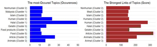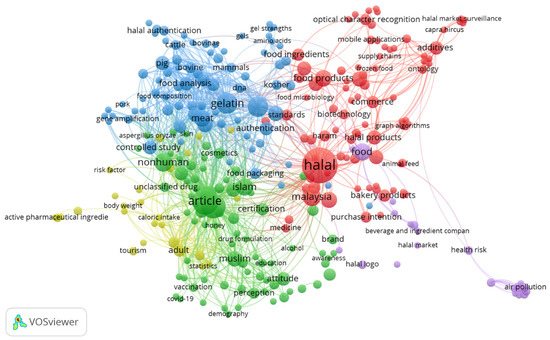 In the co-occurrence analysis, VOSviewer software was used. The minimum number of occurrences of the keyword was two, resulting in 293 keywords meeting the threshold out of the 1704 keywords and 11 clusters. After adjusting the resolution of the cluster from 1.0 to 0.5, the number of clusters changed from 11 clusters to 5 clusters. The five clusters are as follows: cluster 1 (red) represents topics of production, consumption, and the supply chain of halal additives and ingredients; cluster 2 (green) represents market and control/regulation of halal additives and ingredients; cluster 3 (blue) represents detailed types of halal additives and ingredients, raw materials, and their productions; cluster 4 (yellow) implies healthy foods; and cluster 5 (purple) implies logistics, the market, and health effects, as presented in Figure 8.
