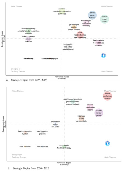 The scientific production (number of articles) grew slowly until 2012, when the number of publications was mostly below ten, and the articles were not produced consecutively. Scientific production began to increase rapidly after 2012, as presented in Figure 4. The first paper on halal-haram additives and ingredients was written in 1999 (which had only one paper) by Morrison and his colleagues [82] titled “Gelatin alternatives for the food industry”. In 2001, two papers [83,84] were published. In 2004, there were two articles published in magazines, titled “New products: Anderol 6000 series food grade lubricants” [85] and “The value of halal food production” [86]. Lastly, there were 25 papers published in 2022, decreasing from 2020, which had 32 publications. Even if the number of publications increased from 1999 to 2022, the average citation per article still needs to be higher, but below five citations, as presented in Figure 4.