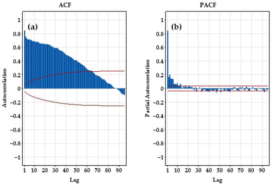 The Box–Jenkins technique was employed to analyze the autocorrelation function (ACF) and partial autocorrelation function (PACF) of ET0 values for the ARIMA model. The ACF and PACF plots indicated that the time series of ET0 was stationary (Figure 2a,b). Therefore, the ARIMA (1, 0, 1) model was implemented for the ET0 estimation. The coefficients of AR1 and MA1 parameters were statistically significant (p < 0.01) based on the results of Maximum Likelihood Estimation (MLE), as shown in Table 1.