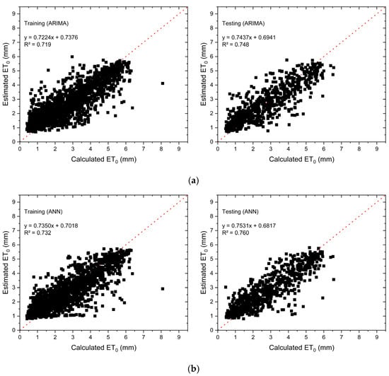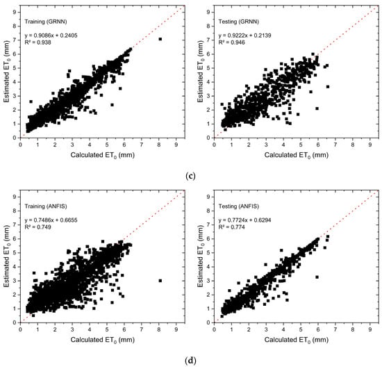 Comparison of calculated and estimated ET0 values using (a) ARIMA, (b) ANN, (c) GRNN, and (d) ANFIS for training (n = 1826) and testing (n = 727) datasets.