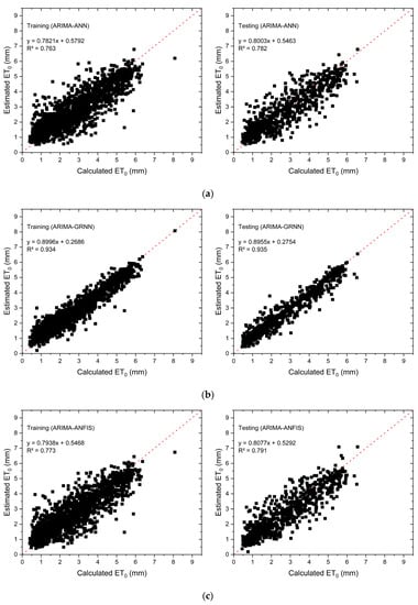 Comparison of calculated and estimated ET0 values using (a) ARIMA–ANN, (b) ARIMA–GRNN, and (c) ARIMA–ANFIS for training (n = 1826) and testing (n = 727) datasets.