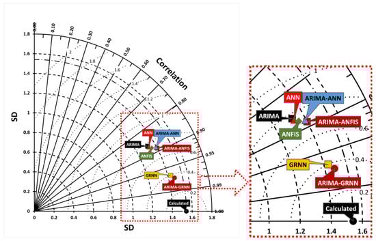 The Taylor diagram, presented in Figure 5, provides an evaluation of the different model’s performance in terms of bias, consistency, and scatter. The black point on the diagram represents the observed ET0 value, while the other points correspond to the models’ predictions. The ARIMA (R = 0.87 and SD = 1.32 mm) and ANN (R = 0.87 and SD = 1.33 mm) models are significantly far apart, indicating their poor performance in estimating ET0 values. On the other hand, the ANFIS (R = 0.88 and SD = 1.35 mm), ARIMA–ANFIS (R = 0.89 and SD = 1.40 mm), and ARIMA–ANN (R = 0.88 and SD = 1.39 mm) models are extremely close, with no noticeable difference between them. Lastly, the GRNN (R = 0.97 and SD = 1.46 mm) and ARIMA–GRNN (R = 0.97 and SD = 1.97 mm) models are the closest to the calculated ET0 results.