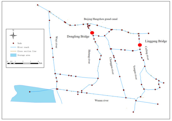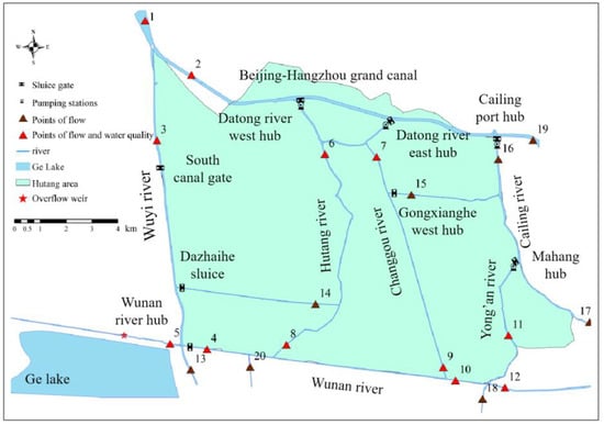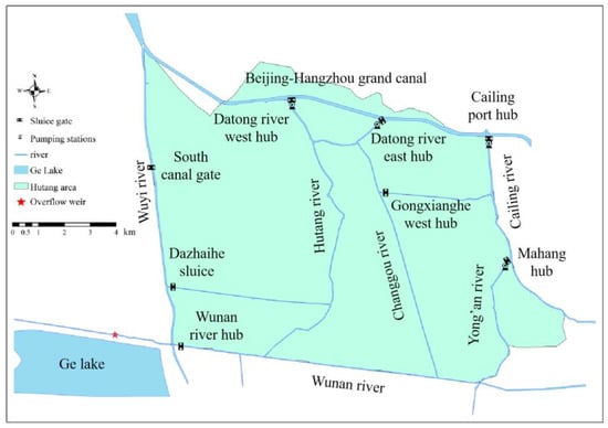 The study area was the Hutang area, which includes a plain urban river network throughout South Changzhou city in the Yangtze River Delta (Figure 1). The urban river network contains 7 main rivers and 4 tributaries. This area extends to the Changzhou section of the Beijing–Hangzhou Canal in the north, the Wuyi Canal in the west, the Wunan river in the south, and the Cailing river in the east, covering an area of 88.963 km2. In detail, there are 5 hubs controlling the inner area for river regulation and one overflow weir out of this area to provide fresh water from Ge lake to the Hutang area.