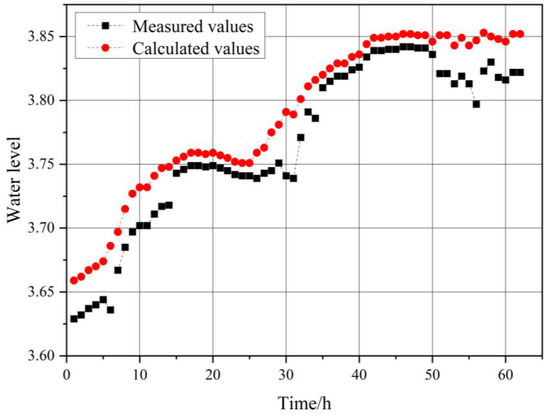 For verification, and based on the calibration, the comparison results of the water level upstream of the Linggang Bridge in the city are shown in Figure 4. The NSE was 0.915, and the relative error was less than 10%. The results showed that the change trends of the calculated and measured water levels were similar for each station, and the average error was also controlled by 3 cm.