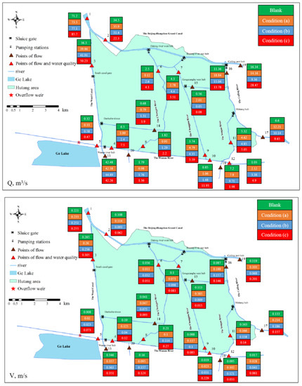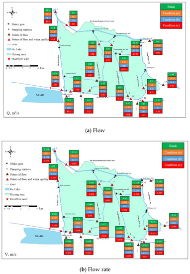 Points 7 and 9 had the highest flow rates under condition (b). The reason for this is that, relative to condition (a), the internal pumping stations are all turned on in condition (b), resulting in an increased flow in the internal channel. Moreover, condition (c) turns on the Mahang junction pumping station at the boundary pumping station of the Hutang area, resulting in the Beijing–Hangzhou Grand Canal being replenished by the Cailing River. Therefore, according to the relationship of water balance [32], the flow of the Beijing–Hangzhou Grand Canal’s diversion into the Hutang River decreases. Therefore, according to the comparison of the flow simulation results, condition (c) is the best operational regulation.