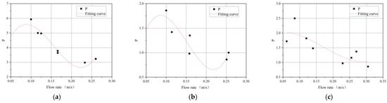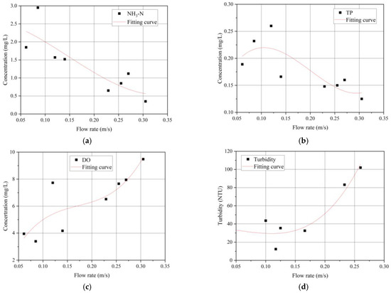 For the points (6 and 7) that flow from the Beijing–Hangzhou Grand Canal into the internal river, the decrease in turbidity under each condition is 11.4%, −46.37%, −8.29% and 43.28%, −3.48%, and −948.09%, respectively. Therefore, from the point of view of turbidity reduction, condition (a) is the most effective of the three conditions. As shown in Figure 8d, the relationship between turbidity and flow rate was calculated using the following fitting equation: