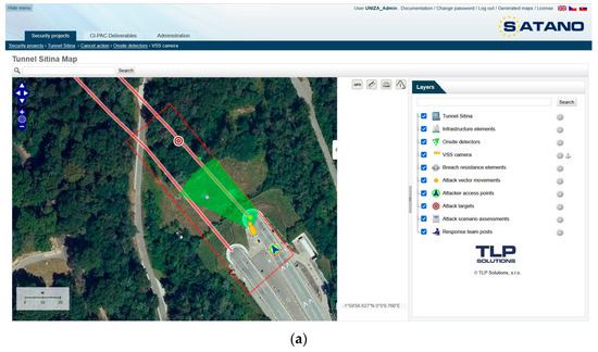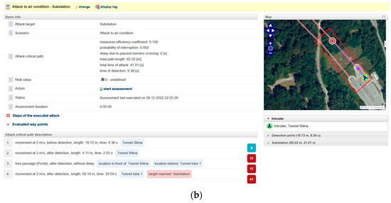 (a) PPS tunnel model using the SATANO SW tool, (b) results of the simulation of the scenario of the intruder attack on the Sitina tunnel substation.
