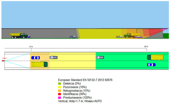 Figure 4 shows that cameras in the range of 15 to 80 m (standardised according to TKP 40) are only capable of motion detection (up to 46% of the scene being shot), which meets the standard to EN 62676-4 [16], according to which only the presence of a person or object can be detected. In the case of the requirement to implement smart solutions (e.g., Intelligent Video Analytics), through which it would be possible to automatically recognise not only the presence of persons in a given space, but also their non-standard behaviour, the scene captured should not fall below the level of observation (more than 16 mm of the captured scene per pixel, i.e., 62.5 px/m) or recognition (more than 8 mm of the captured scene per pixel, 125 px/m). By modelling the ability of the camera to sense non-standard behaviour in the tunnel, using the IP Video Design Tool software tool, it is possible to conclude that the maximum distance between two cameras should therefore be reduced to at least 50 m (it is currently up to 80 m, in accordance with TKP 40), or the minimum camera resolution should be increased (e.g., a camera with a minimum resolution of 5 Mpx).