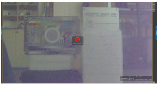 The subject of the test in the climate chamber was a selected camera system from the company, DYNACOLOR. The camera is of environment class 3, which means that its recommended operating temperature range from −10 °C to +50 °C, at a humidity level below 90%. To evaluate the image quality, the CCTV Test Chart was placed in the field of view of the camera at a distance of 2 m. The temperature was gradually raised to the level of +180 °C. The temperature of +152 °C (Figure 5) was the temperature ceiling for the tested camera, which means that the camera stopped fully communicating and sending data to the output-imaging control at this temperature. This measurement showed that the temperature specified by the manufacturer may not always be the limit temperature.