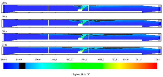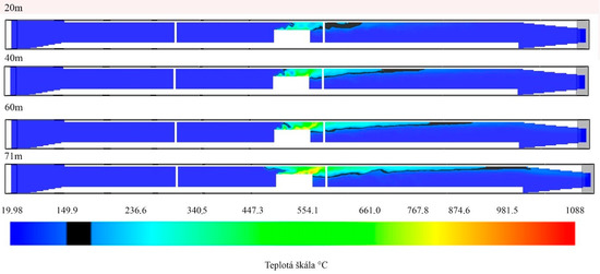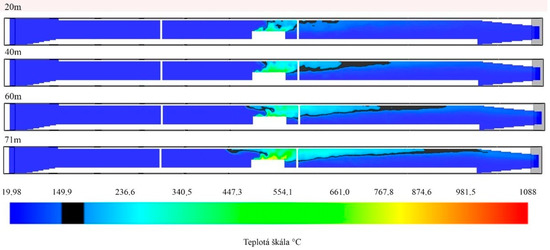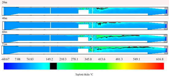 The only option in which the critical temperature was recorded even when the AEE was used was a heat source of 30 MW, which corresponded to the burning of the truck. The results of the simulations are shown in Figure 10 and Figure 11.