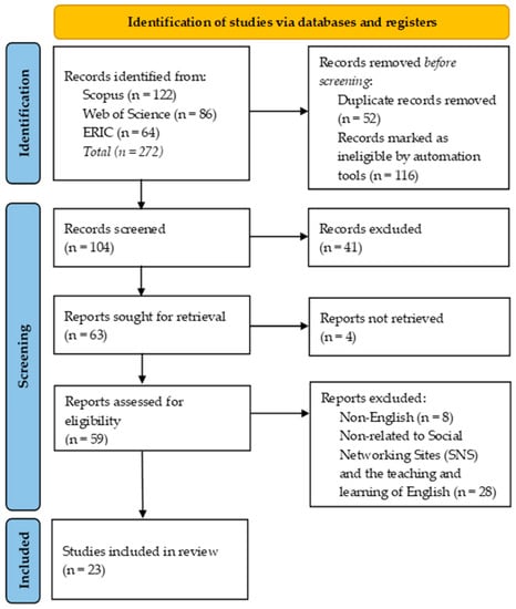 Subsequently, the remaining 104 articles were screened by their titles, abstracts, and keywords to ensure that the studies were related to SNSs in the teaching and learning of English. From this screening process, 41 malapropos articles were removed, resulting in 63 articles eligible for further screening. Eventually, the full text articles were accessed for eligibility so that highly reliable data could be obtained from this study. A total of 36 articles were then removed for the following reasons: full text not written in English language (n = 8) and studies were found unrelated to SNSs and the teaching and learning of English (n = 28).