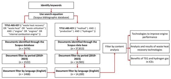 The Scopus data searches were restricted by applying a period filter (2019–2023) and a language filter (English). The number of documents selected from the search equations are shown in Figure 1. Subsequently, the selected documents were filtered taking into account the information provided in the title, abstract, introduction, results, and conclusions. Additionally, the papers were grouped into review articles and research articles. Finally, the documents most related to the proposed topic were used for the construction of Section 3 (technologies to improve engine performance), Section 5 (benefits of TEG and hydrogen gas in ICEs), and Section 4 (analysis and results of waste heat recovery technologies) of the present research.