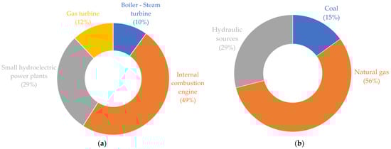 Self-generation in the Colombian industrial sector: (a) Type of technologies; (b) Energy sources. Source: image created by the author based on data from [29].