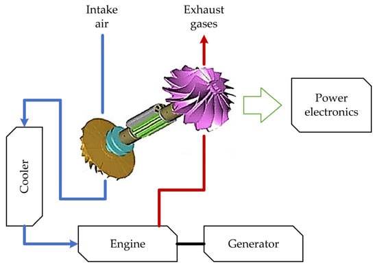 Electric turbochargers (ETC) are electromechanical systems connected to a turbocharger shaft. These types of systems involve using turbines to capture waste heat from exhaust gases and convert it into electrical energy through a generator. Studies indicate that ETC can be used to improve turbocharger performance or as an energy recuperator [42]. A schematic of an ETC is shown in Figure 4.