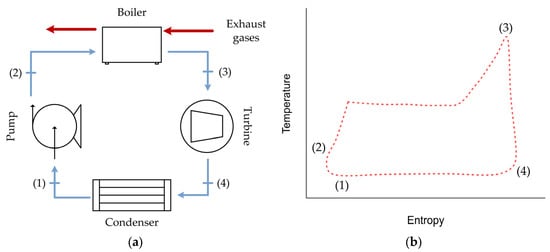 The organic Rankine cycle (ORC) is considered a viable solution for transforming waste heat from exhaust gases into useful energy [43]. The ORC consists of four main elements: feed pump, evaporator, expansion valve, and condenser, as shown in Figure 5.