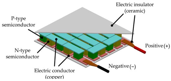 In recent years, thermoelectric generators (TEGs) have been used for waste energy recovery in internal combustion engines. TEGs are devices that have the ability to directly transform the thermal energy of exhaust gases into electrical energy. Due to their operating principle, TEGs have several advantages, such as low noise levels, the absence of moving parts, modular capability, zero emissions, and low maintenance costs [46]. A representation of a TEG is shown in Figure 6.