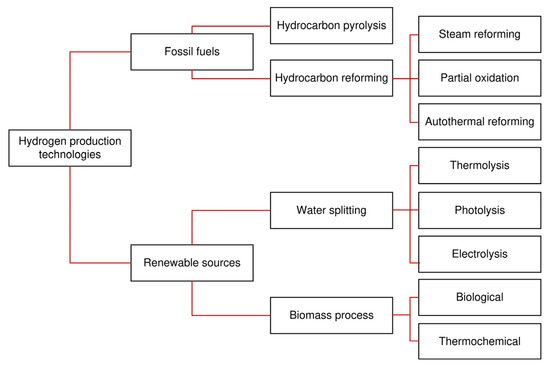 Figure 8 shows that two types of technologies can produce hydrogen: renewable and non-renewable [51]. In the case of renewable technologies, hydrogen is obtained from the use of biomass as a raw material and the chemical division processes of water. For non-renewable technologies, hydrogen is produced from fossil fuels and processes such as pyrolysis and hydrocarbon reforming.