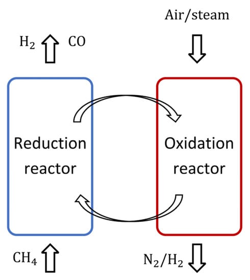 In the first stage, methane is partially oxidized to generate a synthesis gas using oxygen molecules from a redox catalyst (oxygen carrier). During the second stage, the reduced catalyst is further oxidized by steam. On the other hand, the steam is divided for hydrogen generation. Equations (R1)–(R3) show an example of the hydrogen gas production process using steam and as catalysts [53].
