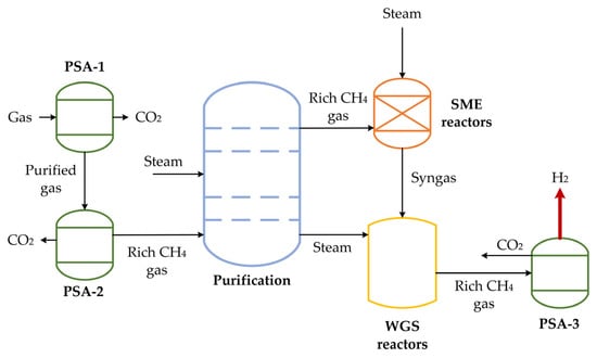 For the production of hydrogen from coal gasification, coal is pulverized, dried, and ground in an air separation unit (ASU). Subsequently, the coal is sent to the gasifier to produce a synthesis gas. The CO gas produced reacts with water vapor to form and in water gas shift (WGS) reactors. Finally, the hydrogen gas is purified by the pressure swing adsorption (PSA) system [56]. Figure 10 shows the schematic of the coal gasification-based hydrogen (CGH) process.