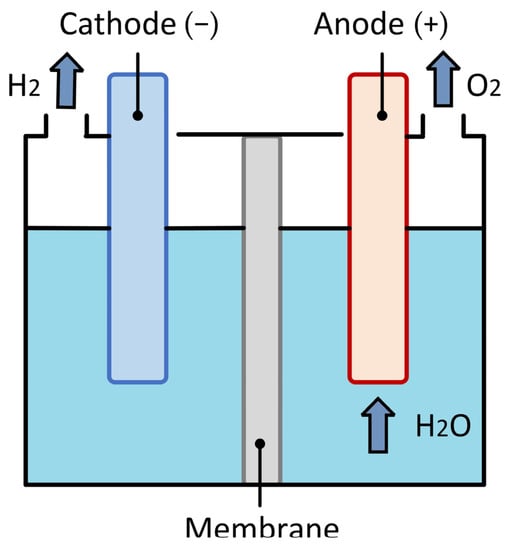 The electrolysis of water allows the production of hydrogen using as the main raw material. Additionally, the only by-product they generate during the process is pure oxygen. During the electrolysis process, water (reactant) molecules dissociate into hydrogen () and oxygen () when exposed to an electrical current. The reaction of the electrolysis process of water is shown in the following equations.