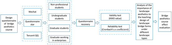 This investigation was conducted with questionnaire groups. The research process structure is shown in Figure 2. First, a questionnaire was designed and sent to the respondents including non-professional students, undergraduate students, graduate students, and graduates working in enterprises, through questionnaire, wechat and tencent QQ, etc. Second, the reliability and validity of the recovered questionnaire were tested. Next, the results of the questionnaire were grouped according to the landscape bridges in the perspective of ecological aesthetics, and the importance of landscape aesthetics to the teaching design of landscape bridge forms under different landscape types was analyzed. Finally, the effect of the bridge aesthetics course was evaluated.