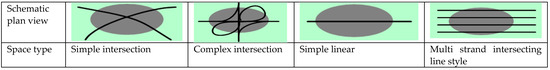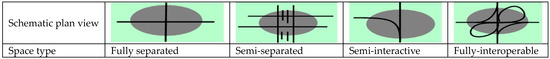 Overpasses are generally located in the main traffic lanes of a city. According to the different space types, they can be divided into four categories: fully separated, semi-separated, semi-interconnected, and fully interconnected. Figure 4 analyzes these structures explicitly.