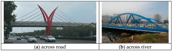 Pedestrian bridges are also called pedestrian overpasses. As the urban traffic network becomes increasingly complex, to avoid traffic jams caused by the interaction between people and vehicles and to address all aspects of pedestrian safety, pedestrian bridges are often built in densely crowded places, thus protecting pedestrians and maintaining the smooth flow of vehicles [33]. They are mainly built on high-traffic roads in cities. With the development of three-dimensional transportation, more and more pedestrian bridges will appear across roads, rivers, etc. The pedestrian bridge form is shown in Figure 5.