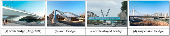 The basic structural forms of modern river-crossing and sea-crossing urban bridges can be divided into suspension bridges, cable-stayed bridges, arch bridges, and beam bridges. Landscape urban bridges are shown in Figure 6.
