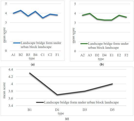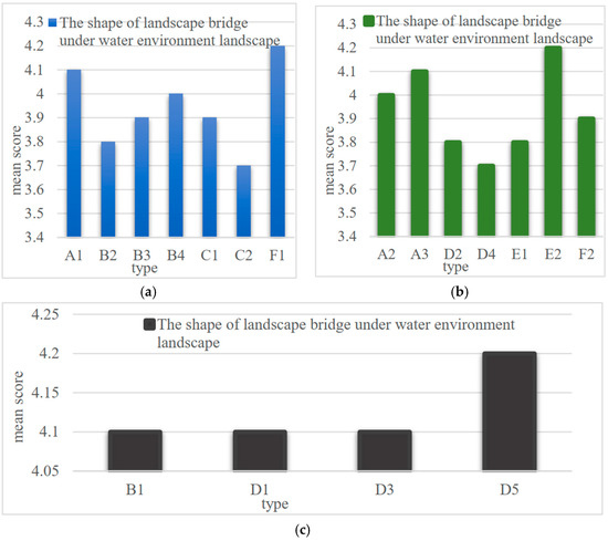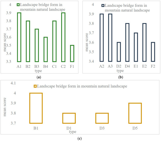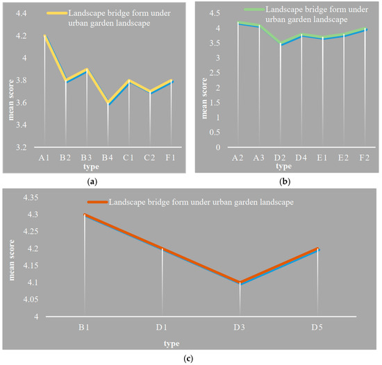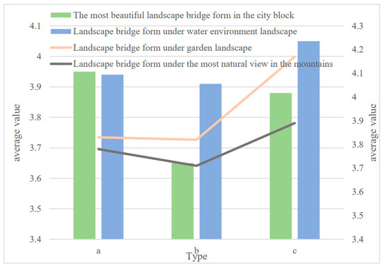 As shown in Figure 11, the questionnaires on the four types of landscape bridges with different landscape types are compared considering the three dimensions of functional beauty (a), formal beauty (b), and environmental factor coordination beauty (c).
