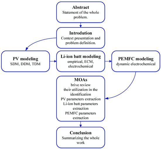 On the other hand, the generated renewable power is submitted to weather conditions that may lead to power fluctuations. In addition, sunlight is unavailable at night, which limits the generation during these specified times. To resolve these problems, energy storage systems such as batteries are required [11]. There are several types of electrochemical batteries; lead acid is the most common, but the lithium-ion type is becoming more commonly used due to its significant advantages [12]. However, the lifetime of each battery is related to its physical features, which provides a high nonlinearity to its mode [13]. The lifespan of a battery cannot be prolonged by reducing power consumption at a certain stage. Instead, it can be extended by how the power is utilized. Furthermore, persistent high-current pulling reduces residual battery capacity [14]. As a result, a battery management system (BMS) is necessary to guarantee that batteries operate safely, reliably, and efficiently. The BMS’ tasks include guaranteeing a battery’s safe operation, over-temperature prevention, managing the charging/discharging phases, and calculating the state of charge (SoC) based on the measured current, voltage, and temperature [15]. However, performing these tasks and estimating these states depends on the battery model. Therefore, an accurate battery model is required, and its accuracy is related to the accuracy of the parameters identification. Furthermore, parameter identification is critical in PV system modeling, performance assessment and optimization, and real-time control [16]. Since the importance of parameter identification has grown significantly, a wide range of studies has been conducted to find realistic and practical solutions to such difficulties.