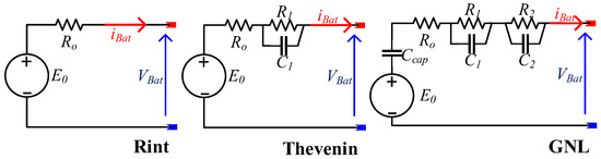 ECM consists of a SOC-related voltage source, an internal ohmic resistor, and resistance–capacitance (RC) pairs that may represent the inputs (current, temperature, and SOC) and the output (voltage) relationship. The resistor represents self-discharge. The diffusion process in the electrolyte, porous electrode charge transfer and double-layer effect in the electrode is represented by the RC pairs with various time constants. The commonly used models in this category include the Rint model [54], Thevenin model [55], and General Nonlinear (GNL) [56]. The architecture of the models is presented in Figure 4.