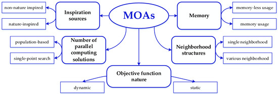 “Meta” and “heuristic” are Greek terms that mean upper level or beyond for the meta term, and to find, to know, to lead an investigation, or to discover for the heuristic term [62]. They are strategies created to find (sub-)optimum solutions at a low computing effort without ensuring feasibility or optimality [30]. Most of these algorithms imitate biological or physical processes and have a stochastic behavior. Metaheuristic algorithms have been classified according to five metrics [63]: