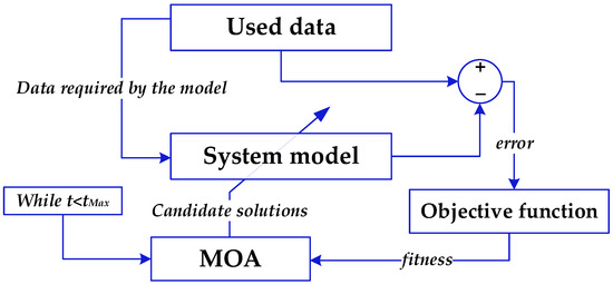 The identification algorithm provides the model parameters based on the input data, the used model, and the implemented objective function. The optimizer generates a set of random parameters limited in the search space. These parameters are used to initialize the model, and its output will be compared to the used data. Based on this error, the objective function is calculated, and the candidate solutions will be updated. As illustrated in Figure 7, the system parameters can be extracted based on the measured data and the considered model. After establishing the model, input data required by the model will be used to generate the estimated output data. These generated data will be compared with the measured one, and the error between them will be used to generate the fitness value for the optimization algorithm. The optimizer updates the candidate solutions and steps to the next iteration based on the fitness value.
