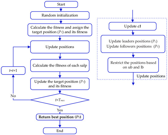 A meta-heuristic technique called SSA looks for the best solutions to a given issue within a constrained search area [64]. The search begins at arbitrary locations. The individuals (the salps) will chain together and move in the direction of the best solution. Leaders and followers are the two categories that make up this chain. The leaders pursue the target position rapidly. Each follower will evolve his position in line with the location of his prior agent as they move seamlessly. The leaders can update their positions (PL) at the iteration (t) as follows: