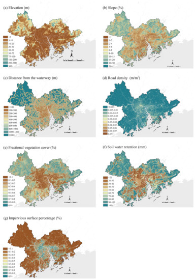 The spatial distribution of elevation; slope; distance from the waterway; road density; fractional vegetation cover; soil water retention; and impervious surface percentage on GBA.