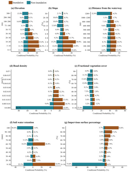 Figure 3 illustrates the changes in the conditional probability of inundation or non-inundation under the conditions of the seven spatial variables identified. Various variables exerted inconsistent effects on the probability of the urban areas with or without flooding risks. Specifically, the conditional probability of inundation decreases with DEM increase, since stormwater runoff flows downhill as expected [52]. As presented in Figure 3b, the conditional probability of inundation decreased with SLOP increase, since relatively flat topography usually drains surface runoff ineffectively and tends to exhibit a higher probability of urban flooding [53,54]. As for DW, the conditional probability was determined to be the greatest when DW was greater than 1200 in non-inundation (Figure 3c). As illustrated in Figure 3d, the probability of non-inundation in a low RD (0–0.005 m/m2) region was 84.2%. As RD increased, this probability decreased, suggesting that urban flooding was unlikely to occur in regions with low RD values. Furthermore, a higher conditional probability of inundation (78.6%) was mainly observed in areas with low FVC (0–10%) (Figure 3e). Thus, it can be speculated that urban flooding risks increased with decreased vegetation coverage. The lower the FVC value, the less favorable the vegetation growth conditions and the higher the flooding risks [55]. On the contrary, with the larger ISP values, the higher conditional probability of urban flooding was observed (Figure 3g). This finding was consistent with previous studies conducted by Zhang et al. [56] and Guo et al. [57].