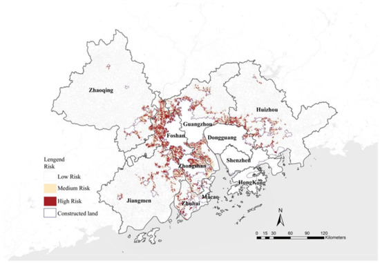 The natural fracture method was used for the classification of flood disaster risk, i.e., low risk (0–23.0%), medium risk (23.0–43.7%), and high risk (43.7–83.2%). As presented in Table 3, there were 3106.4 hm2 of rural-urban fringe with high risk, accounting for 25.7% of the total area of the investigated rural-urban fringe. Nearly half of the rural-urban fringes were under exposure of medium risk. Figure 4 illustrates the spatial distribution of the risk of urban flooding. The areas with high risk were mainly distributed in Foshan, Zhongshan, and Guangzhou. Furthermore, there was a great number of natural green spaces encroaching upon these cities due to the fast urbanization process and the continuous increase in impervious surfaces. In particular, such areas had not yet formed a comprehensive infrastructure system, which cannot effectively manage surface runoff during extreme stormwater event, leading to the occurrence of urban flooding.