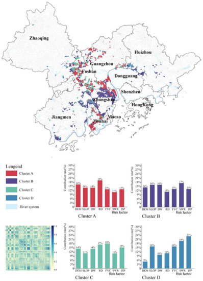 Cluster B-4, which was located primarily in sandy areas along rivers or coasts, such as tidal flats, was driven by DEM and SWR. Cluster D-2 was mainly situated in rural areas, mixed with industrial and residential areas. Encroached by industrial areas, vegetation coverage was reduced, while the percentage of impervious surfaces was increased. Therefore, future planning should be implemented to reduce surface runoff by controlling the size of industry areas and increasing low-impact development practices [60]. In addition, located near fish ponds, Clusters C-4 and D-4 were primarily driven by DW, FVC, and SWR. Overflowing rivers caused flood disasters; thus, strengthened strategies, such as water-body conservation, flood risk monitoring, and early warning, should be formulated.