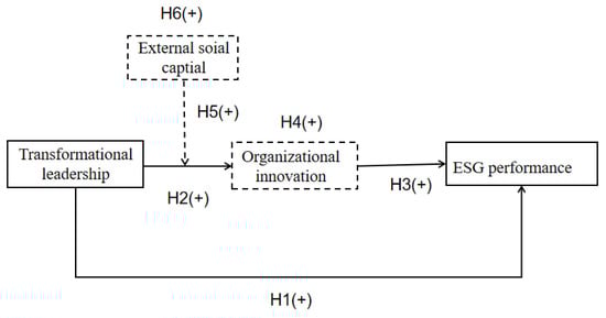 Although ESG theories have proliferated in recent years, however, most studies focus on developed markets [30], and very few studies investigate emerging markets [31,32]. China is on a high-quality development path but is still in the early stages of ESG development. Investors and companies still do not have a clear understanding of what ESG performance means in terms of corporate sustainability, or of the mechanisms underlying the role of leadership in corporate ESG performance. This paper uses higher-order behavior theory, social network theory, resource-based theory, and stakeholder theory as a foundation to investigate the effect of transformational leadership through organizational innovation on ESG performance of SMEs in China by distributing questionnaires to leaders and employees as a sample, as well as the moderating role of external social capital in transformational leadership and organizational innovation. The result indicates that transformational leadership has a positive impact on the ESG performance of SMEs. Organizational innovation partially mediates the relationship between transformational leadership and corporate ESG performance. Furthermore, the role of transformational leadership in organizational innovation is stronger when firms have higher levels of external social capital.