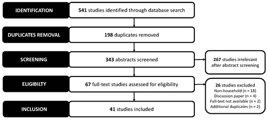 Two reviewers screened titles and abstracts against the inclusion and exclusion criteria, and then articles were further assessed through full-text screening (Figure 1). The following data were extracted from eligible articles (n = 41): author(s), year of publication, geographical location of the study, methodology, when (month/year) data were collected, sample size, quantity and composition of food waste generated during COVID-19, and changes in food waste quantities and/or composition during COVID-19. When necessary, a reviewer emailed corresponding authors to ask for further data; however, many of these emails went unanswered.